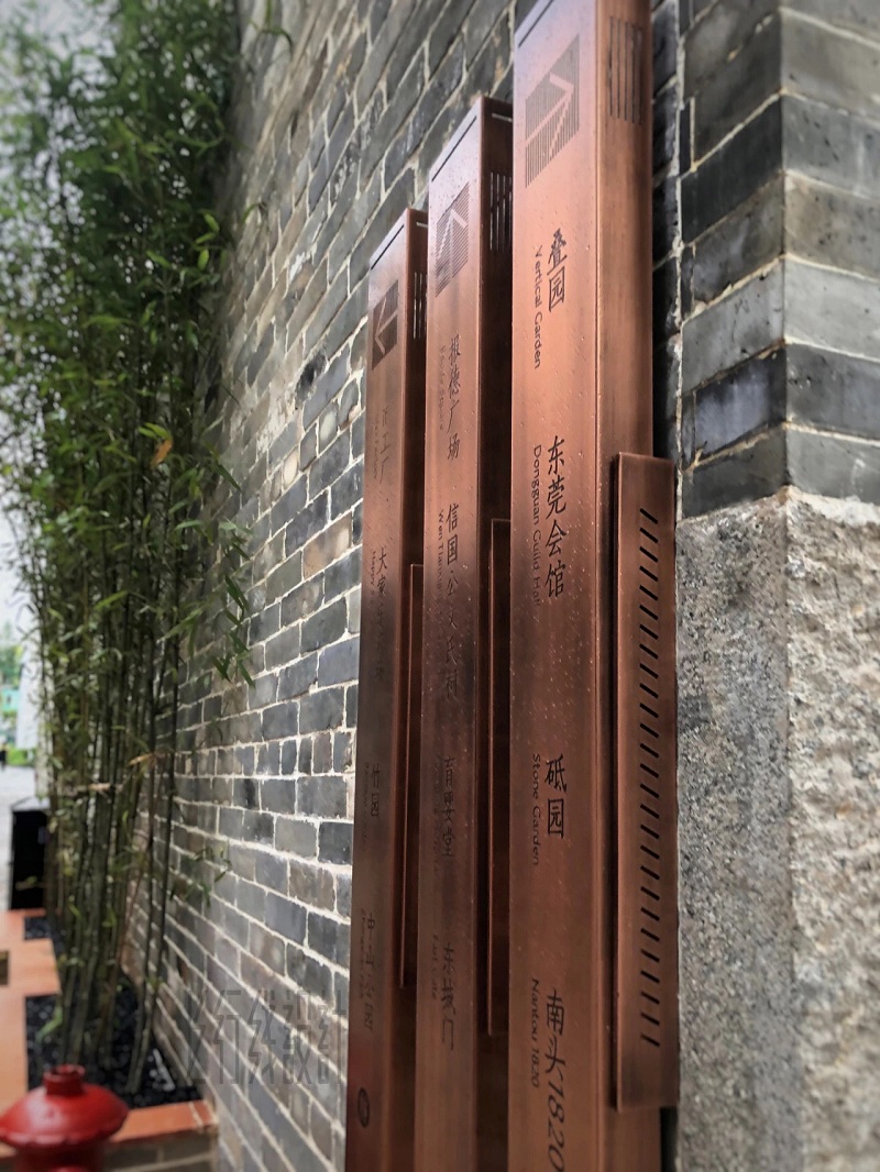 遵從歷史印記,還原本土文化,在導(dǎo)視系統(tǒng)的細(xì)節(jié)表達上,從粵港文化和民生風(fēng)俗著手,挖掘礎(chǔ)石、門幡等元素特征,結(jié)合自然肌理的石材、手工感的黃銅、傳統(tǒng)豎排文字等細(xì)節(jié),傳遞出年代感、人文感。
